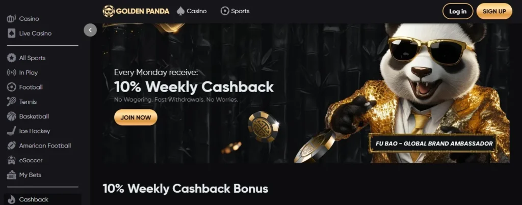 The headline offer at Golden Panda provides new players with a 200% deposit match, reaching a maximum bonus value of €7,500. This positions the site among the higher-tier welcome packages in the offshore casino space. The 10% weekly cashback component runs independently, calculated on net losses across eligible games throughout each seven-day period.